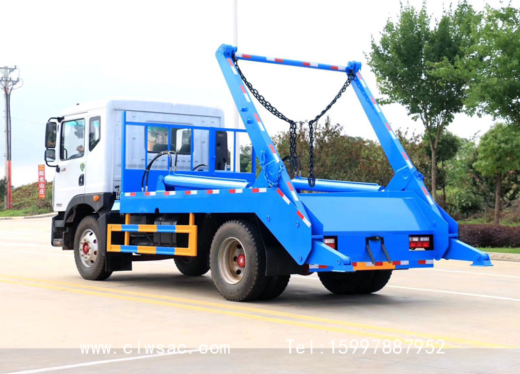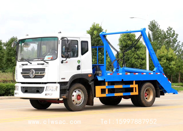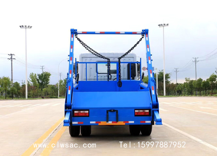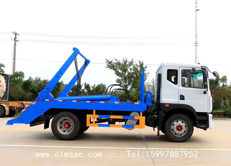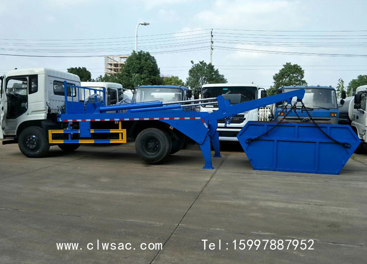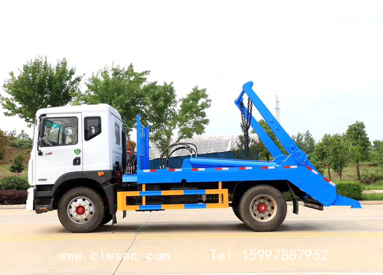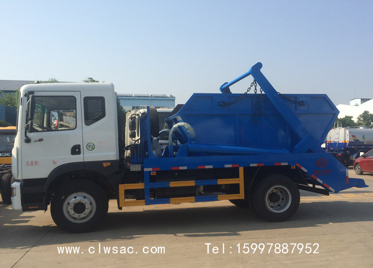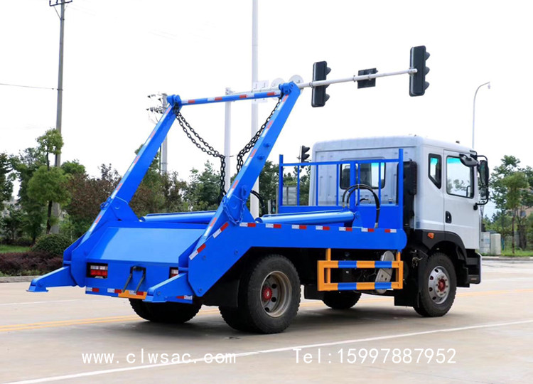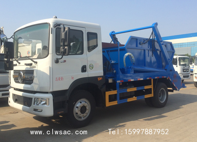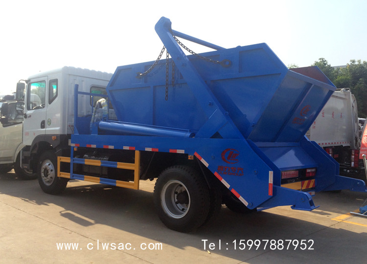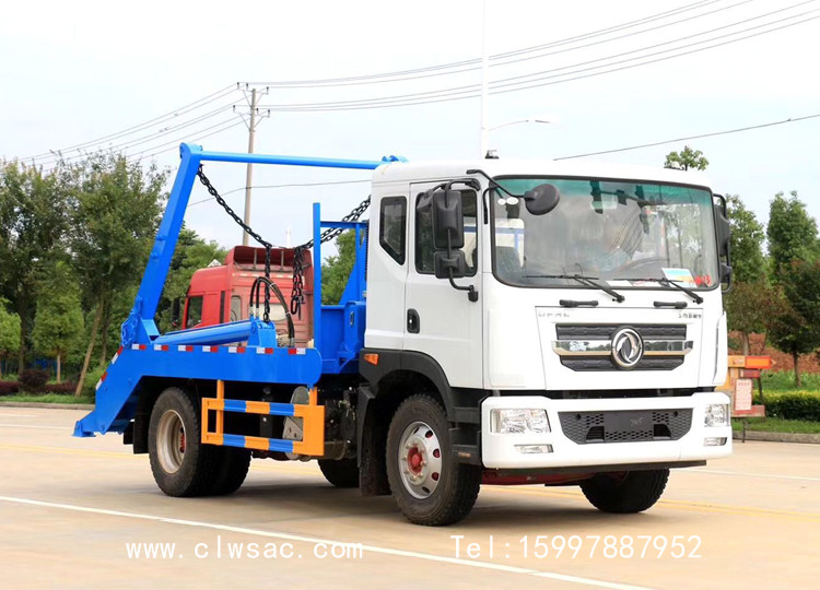 该车驾驶舒适、操纵方便、机动灵活、可靠性高。摆臂式垃圾车的特点是可将地上、地下垃圾箱内的垃圾及垃圾箱一同吊至车上运走同时可自卸,降低了工人的劳动强度。该垃圾车的收运方式是目前世界上广泛采用的垃圾收运方式,可以实现一车多箱,大大降低了配备成本和空间等等;其专用装置的功能均以汽车发动机为动力,通过液压机构手动或电控来实现。车辆的箱体采用优质炭钢板焊接,具有强度高、重量轻、不产生二次污染等优点。