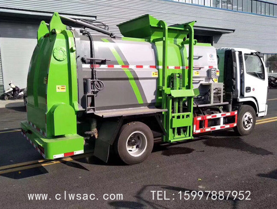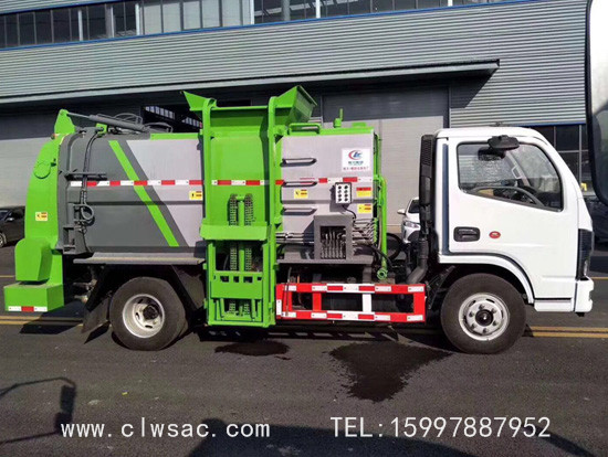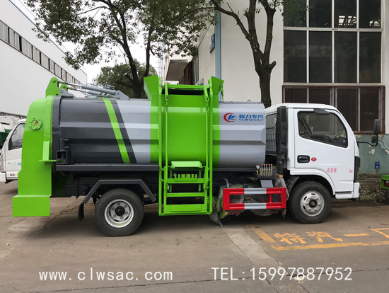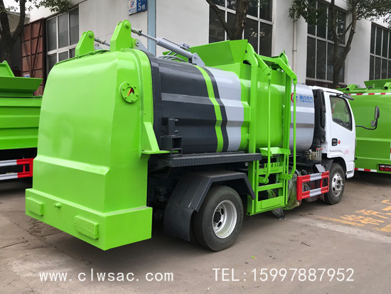 容积约5立方,方弧形厢体,边4底5板材,链条式提升机(可挂120L和240L垃圾桶),后门油缸液压开启,厢体内部安装推铲卸料及固液分离装置,标配厢体不带举升;厢体前部隔一个约300L水箱,带清洗机及清洗卷盘;驾驶室内外电动控制