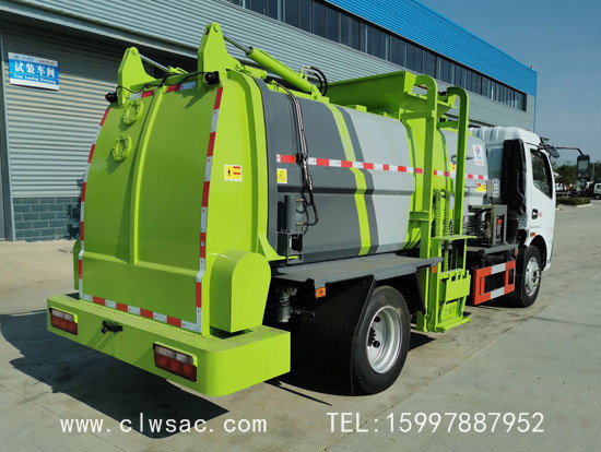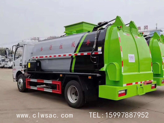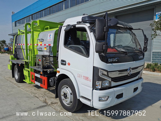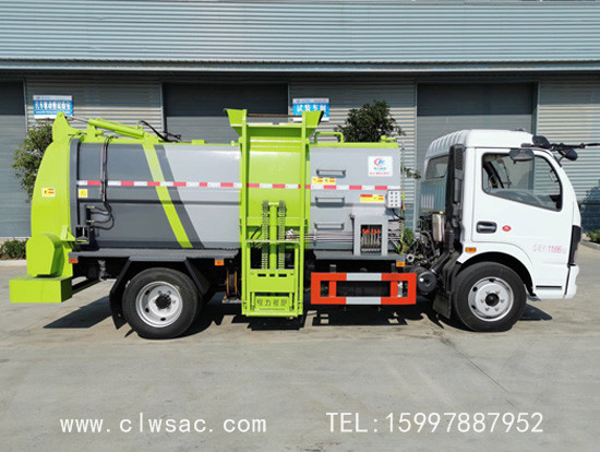 上装配置:容积约7立方,方弧形厢体,边4底5板材,链条式提升机(可挂120L和240L垃圾桶),后门油缸液压开启,厢体内部安装推铲卸料及固液分离装置,标配厢体不带举升;厢体前部隔一个约300L水箱,带清洗机及清洗卷盘;驾驶室内外电动控制。