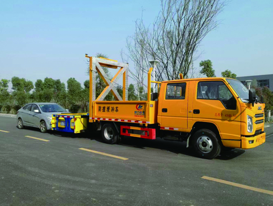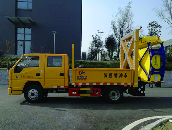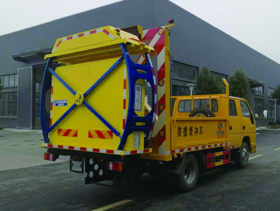 防撞缓冲车主要用于高速公路施工,隧道施工,公路施工等工程时,最大限度的降低了施工车辆、养护人员和事故处理的交警的安全风险问题。防撞缓冲车主要是在二类底盘的基础上加装专用导向架和防撞缓冲垫等组成,可以在临时性车道封闭的路段给养路工人及设备提供全面的被动安装防护,通过防撞包的变形均匀逐渐的缓消碰撞的动能,对施工人员及设备进行有效的保护,同时最大限度地保护撞击车辆内人员的安全。