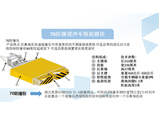 1、防撞缓冲吸能模块采用美国全进口新型“车载式防撞缓冲吸能模块”,通过美国NCHRP350 TL-3碰撞测试,可吸收2吨重车辆时速100公里/小时的冲击能量,可直接拖挂于主车后部;由两个碰撞后溃缩吸能的轻体铝制吸能包和一个可重复使用的折叠镀锌支撑架组成,两个轻体铝制吸能包可根据碰撞损伤程度单独更换其中之一。
