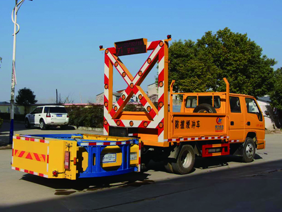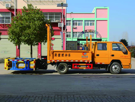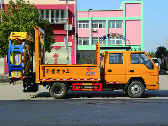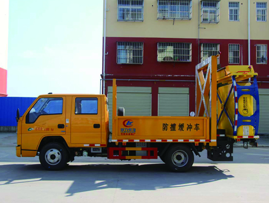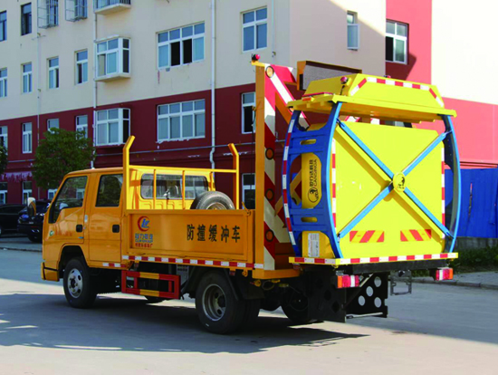 防撞缓冲车主要用于高速公路施工,隧道施工,公路施工等工程时,最大限度的降低了施工车辆、养护人员和事故处理的交警的安全风险问题。防撞缓冲车主要是在二类底盘的基础上加装专用导向架和防撞缓冲垫等组成,可以在临时性车道封闭的路段给养路工人及设备提供全面的被动安装防护,通过防撞包的变形均匀逐渐的缓消碰撞的动能,对施工人员及设备进行有效的保护,同时最大限度地保护撞击车辆内人员的安全。