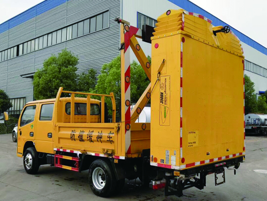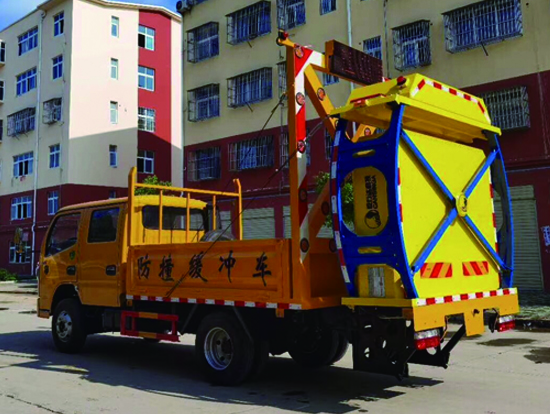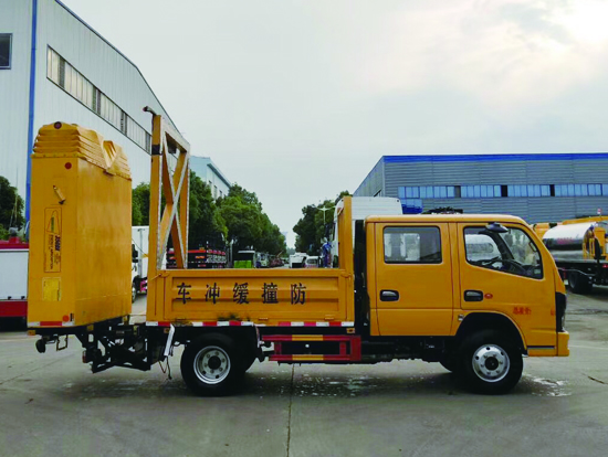 防撞缓冲车主要用于高速公路施工,隧道施工,公路施工等工程时,最大限度的降低了施工车辆、养护人员和事故处理的交警的安全风险问题。防撞缓冲车主要是在二类底盘的基础上加装专用导向架和防撞缓冲垫等组成,可以在临时性车道封闭的路段给养路工人及设备提供全面的被动安装防护,通过防撞包的变形均匀逐渐的缓消碰撞的动能,对施工人员及设备进行有效的保护,同时最大限度地保护撞击车辆内人员的安全。