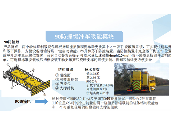1、防撞缓冲吸能模块采用美国全进口新型“车载式防撞缓冲吸能模块”,通过美国NCHRP350 TL-3碰撞测试,可吸收2吨重车辆时速100公里/小时的冲击能量,可直接拖挂于主车后部;由两个碰撞后溃缩吸能的轻体铝制吸能包和一个可重复使用的折叠镀锌支撑架组成,两个轻体铝制吸能包可根据碰撞损伤程度单独更换其中之一。