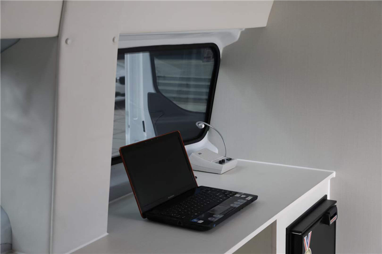 程力公司的福特V362核酸取样车,采用福特V362商务车底盘为基础,加装了工作台,洗手消毒池,照明设备,核酸取样窗口非直接接触方式安全快捷,车上带有电源,可使用电脑,广播,冰箱,及大的保护了医务工作者的安全和提高了工作效率。