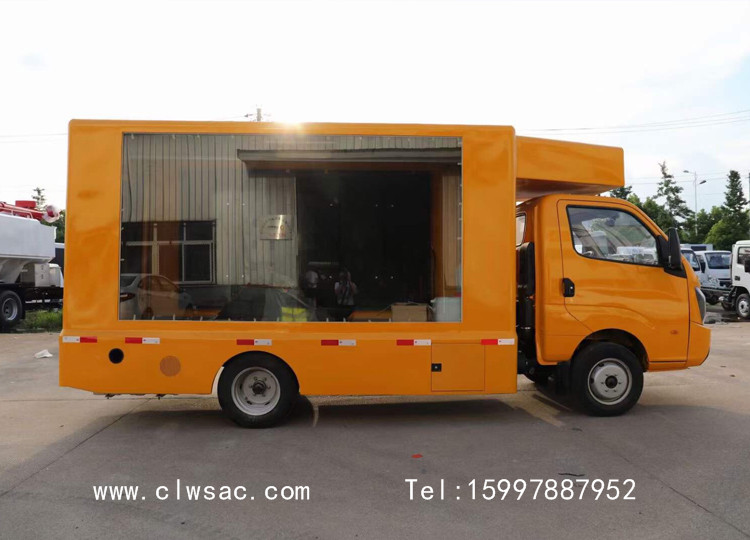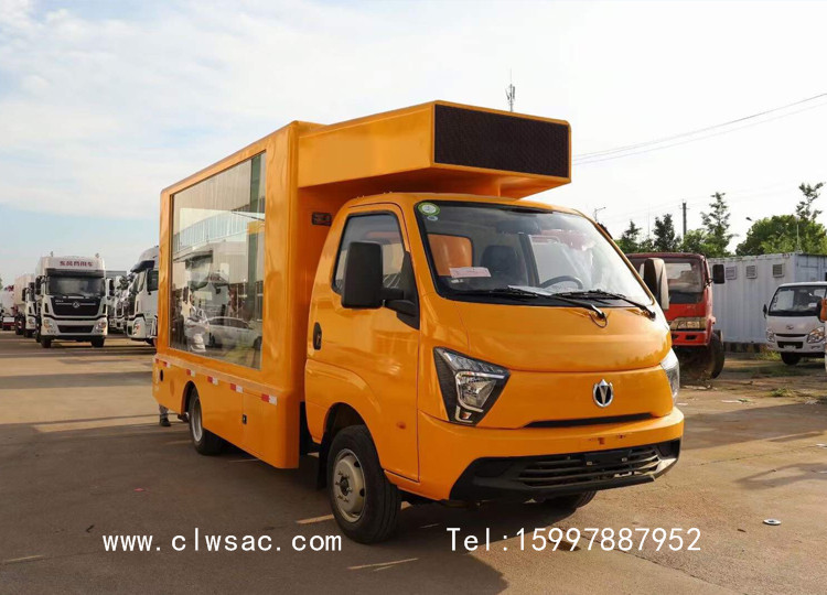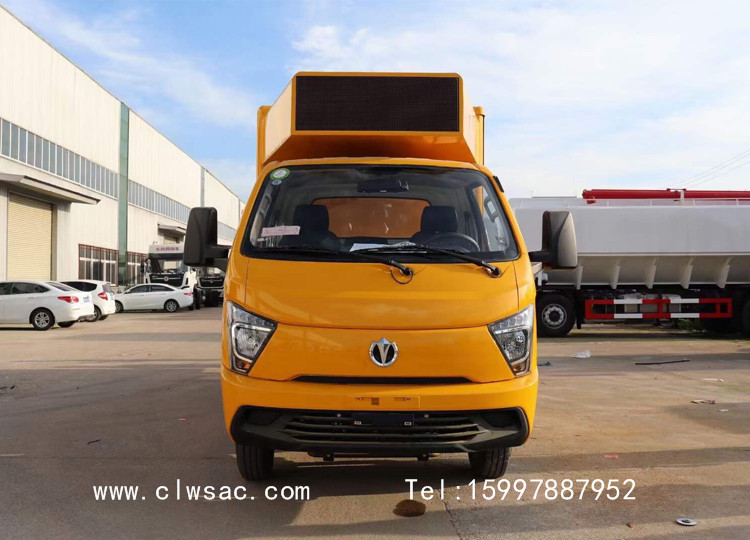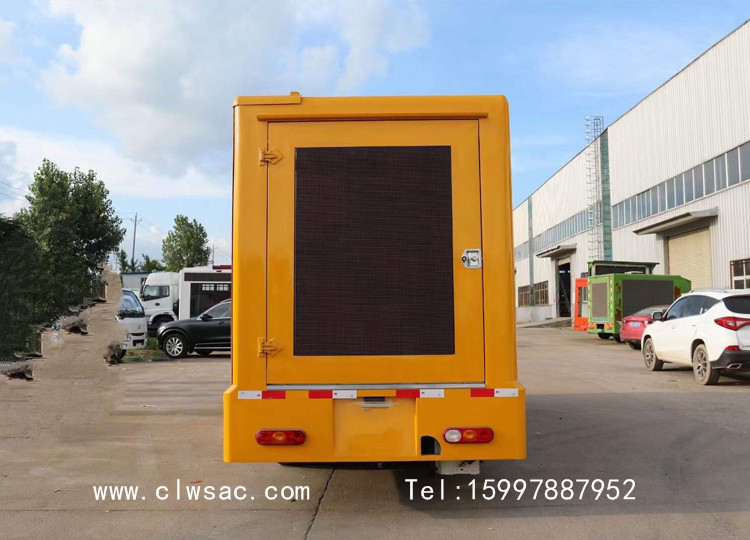 该车采用飞碟后双轮系列底盘,加装厢体、户外LED全彩屏、滚轴灯箱、音响、功放、发电机或电池组、工况电脑、通风系统等改装而成,安装重庆小康发动机,排放达到国六标准。