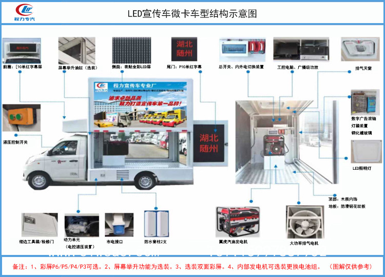 该车采用福田祥菱系列底盘,加装厢体、户外LED全彩屏、滚轴灯箱、音响、功放、发电机或电池组、工况电脑、通风系统等改装而成,安装柳州五菱,全柴等发动机,排放达到国六标准。