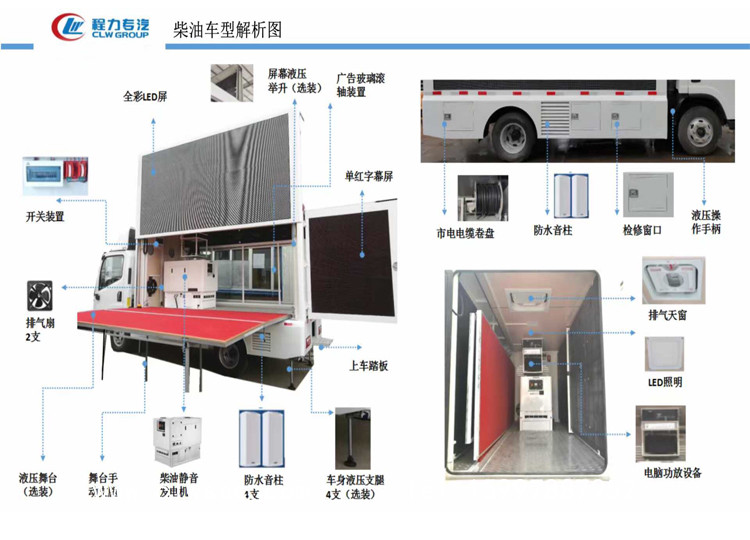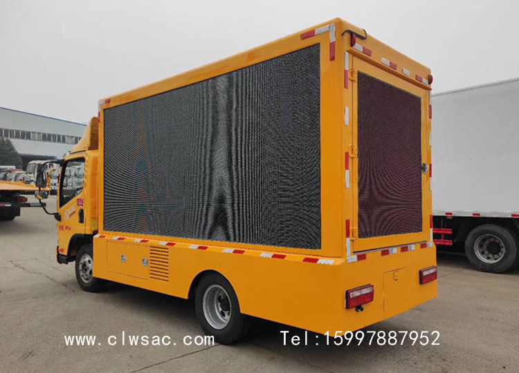 该车采用解放虎V系列底盘,加装厢体、户外LED全彩屏、滚轴灯箱、音响、功放、发电机或电池组、工况电脑、通风系统等改装而成,安装全柴等发动机,排放达到国六标准。