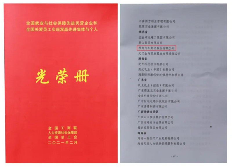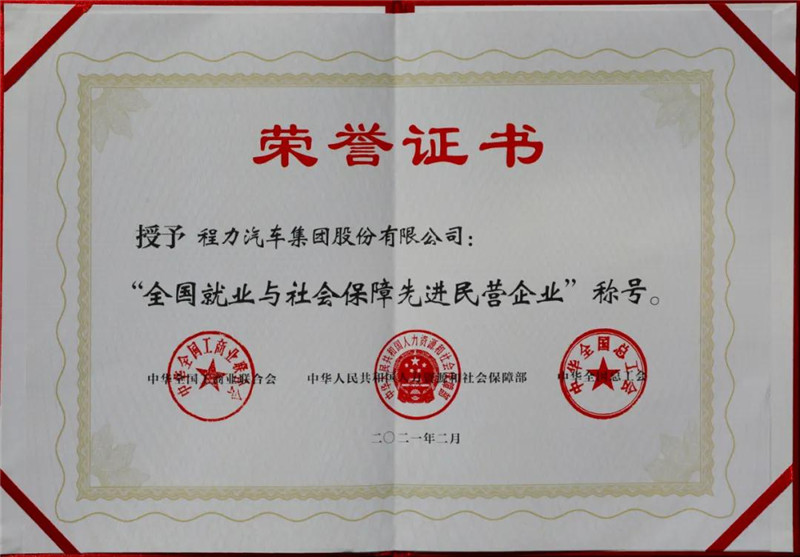 程力汽车集团股份有限公司收到国家人力资源和社会保障部、中华全国工商业联合会、中华全国总工会联合颁发的“全国就业与社会保障先进民营企业”荣誉证书及牌匾,这是程力汽车集团股份有限公司在2021年初被授予的开门红全国性殊荣,也是程力集团继2020年连续三次受到全国性荣誉表彰。