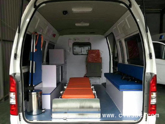 1、长排救护警灯及四周爆闪灯;2、自动上车担架;3、折叠担架;4、供氧系统:氧气瓶及氧气瓶柜、快速接口;5、左侧整体医疗柜;6、工作座椅、陪护座椅;7、消毒灯1只;8、输液吊钩2只;9、1000W逆变器1只;10、外接电源系统;11、换气扇;12、12V照明灯2只;13、220V电源插座2个;14、电源控制面板1套;15、中隔板(带观察窗);16、可冲洗医用耐磨地板;17、污物桶;18、车身广告及救护标识;19、后舱空调和暖风