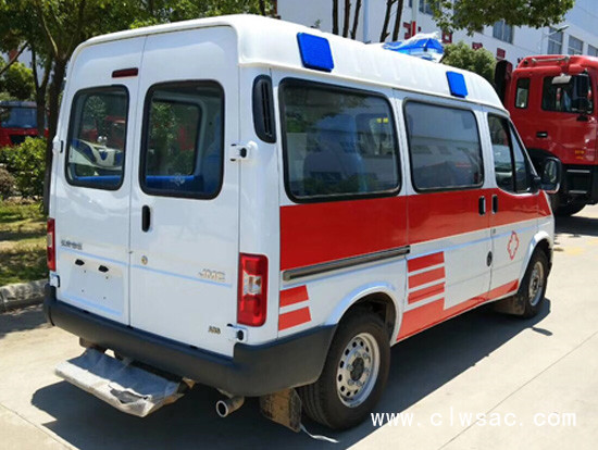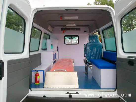 1、前顶装全蓝警灯警报器1套;2、自动上车担架;3、医药柜1件;4、固定安装氧气瓶1只;5、输液吊钩2只;6、消毒灯1只;7、污物桶1只;8、单人座椅2只;9、长条座椅2人位软座垫、软靠背和安全带1套;10、中隔断带滑窗1套;11、12V照明灯2只;12、500W逆变器1只;13、220V电源插座1组;14、医用耐磨塑胶地板革;15、贴救护十字标志;16;后舱空调和暖风