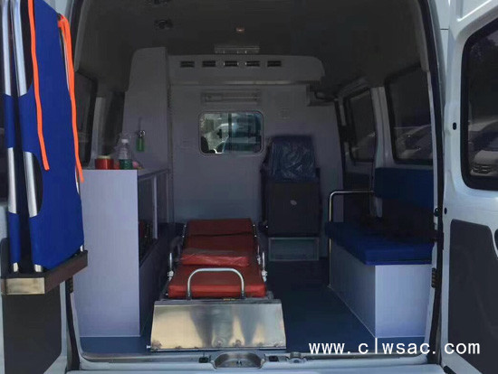 1、长排救护警灯及四周爆闪灯;2、自动上车担架;3、折叠担架;4、供氧系统:氧气瓶及氧气瓶柜、快速接口;5、左侧整体医疗柜;6、工作座椅、陪护座椅;7、消毒灯1只;8、输液吊钩2只;9、1000W逆变器1只;10、外接电源系统;11、换气扇;12、12V照明灯2只;13、220V电源插座2个;14、电源控制面板1套;15、中隔板(带观察窗);16、可冲洗医用耐磨地板;17、污物桶;18、车身广告及救护标识;19、后舱空调和暖风