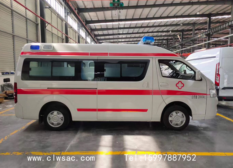 福田G7救护车型号CL5032XJHYS6,福田风景G7救护车采用福田公司生产的原装底盘,G7豪华车身,5档变速器,前空调,暖风,感载比例阀。总质量2.86吨,整备质量:2.2吨,驾驶室额定载客2-7人。整车外形尺寸:5320×1695×2240,2460mm,轴距:3050mm,最高车速:135km h。配195/70R15LT真空胎,前轮距1470mm,后轮距:1465mm。北汽福田牌正宗国六发动机,发动机型号:4K22D4M,发动机排量:2378 ml,发动机功率:118kw。 驾驶室内部空间宽敞,配备空调、点烟器、收音机等装置。