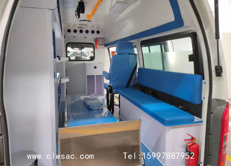 1、前顶装全蓝警灯警报器1套;2、自动上车担架;3、医药柜1件;4、固定安装氧气瓶1只;5、输液吊钩2只;6、消毒灯1只;7、污物桶1只;8、单人座椅2只;9、长条座椅2人位软座垫、软靠背和安全带1套;10、中隔断带滑窗1套;11、12V照明灯2只;12、500W逆变器1只;13、220V电源插座1组;14、医用耐磨塑胶地板革;15、贴救护十字标志;16;后舱空调和暖风