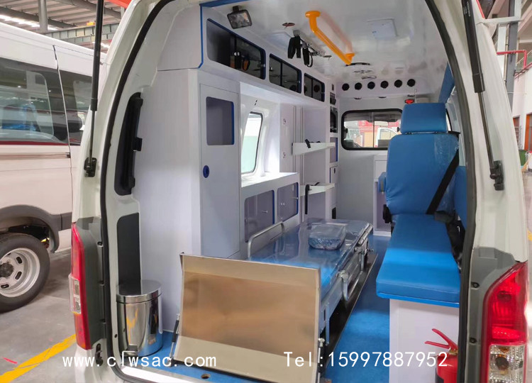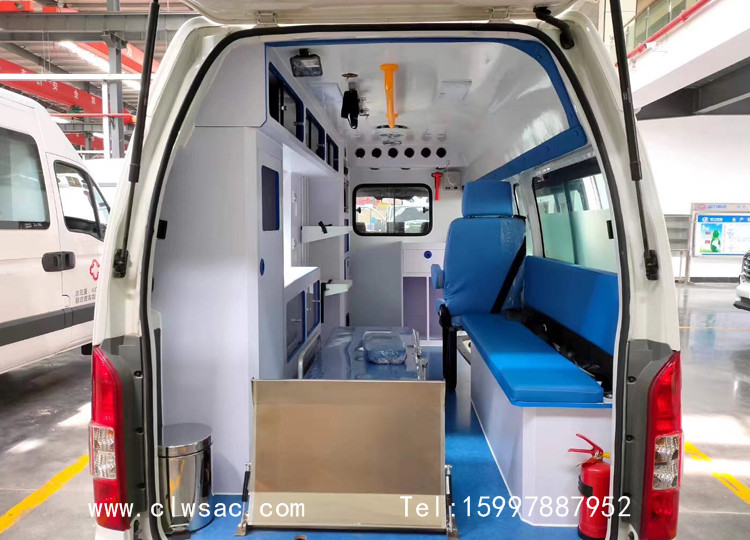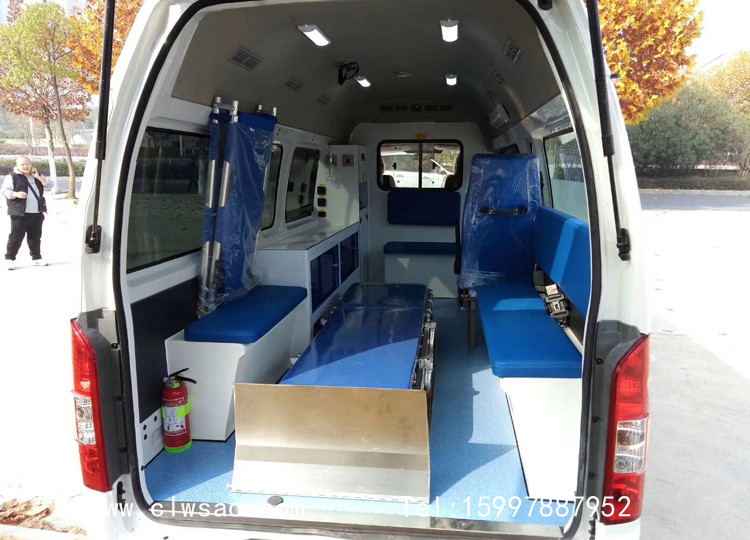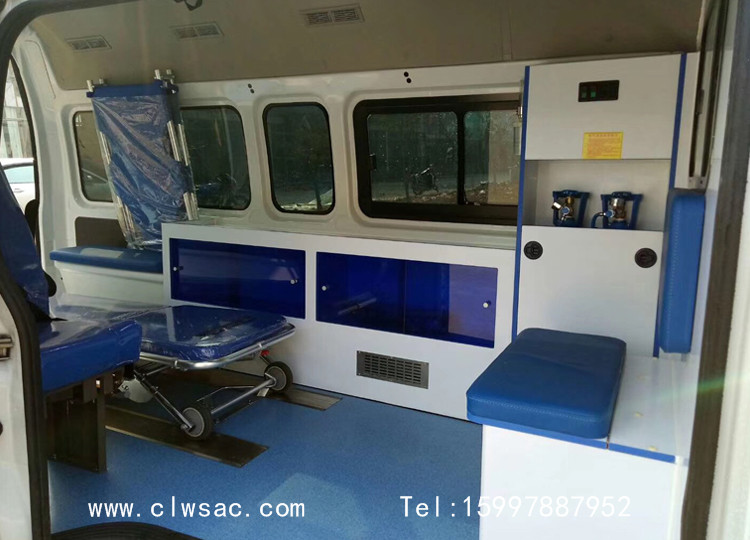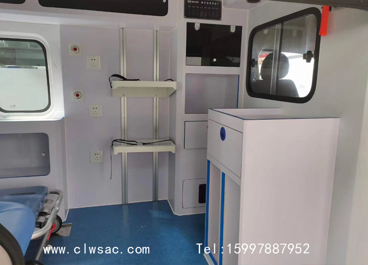 1、长排救护警灯及四周爆闪灯;2、自动上车担架;3、折叠担架;4、供氧系统:氧气瓶及氧气瓶柜、快速接口;5、左侧整体医疗柜;6、工作座椅、陪护座椅;7、消毒灯1只;8、输液吊钩2只;9、1000W逆变器1只;10、外接电源系统;11、换气扇;12、12V照明灯2只;13、220V电源插座2个;14、电源控制面板1套;15、中隔板(带观察窗);16、可冲洗医用耐磨地板;17、污物桶;18、车身广告及救护标识;19、后舱空调和暖风