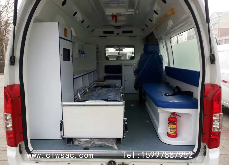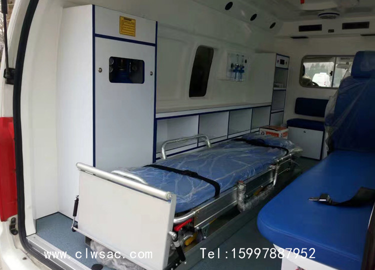 1、长排救护警灯及四周爆闪灯;2、自动上车担架;3、折叠担架;4、供氧系统:氧气瓶及氧气瓶柜、快速接口;5、左侧整体医疗柜;6、工作座椅、陪护座椅;7、消毒灯1只;8、输液吊钩2只;9、1000W逆变器1只;10、外接电源系统;11、换气扇;12、12V照明灯2只;13、220V电源插座2个;14、电源控制面板1套;15、中隔板(带观察窗);16、可冲洗医用耐磨地板;17、污物桶;18、车身广告及救护标识;19、后舱空调和暖风