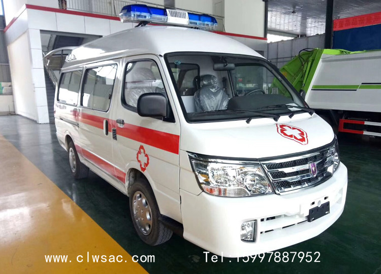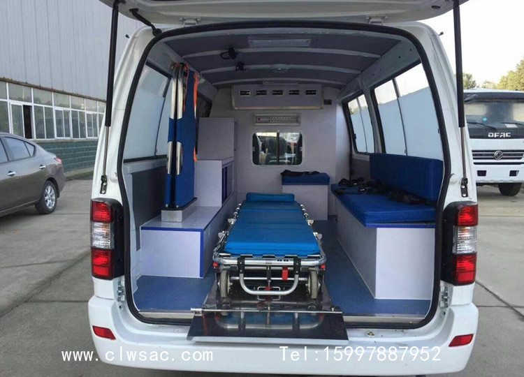 1、前顶装全蓝警灯警报器1套;2、自动上车担架;3、医药柜1件;4、固定安装氧气瓶1只;5、输液吊钩2只;6、消毒灯1只;7、污物桶1只;8、单人座椅2只;9、长条座椅2人位软座垫、软靠背和安全带1套;10、中隔断带滑窗1套;11、12V照明灯2只;12、500W逆变器1只;13、220V电源插座1组;14、医用耐磨塑胶地板革;15、贴救护十字标志;16;后舱空调和暖风