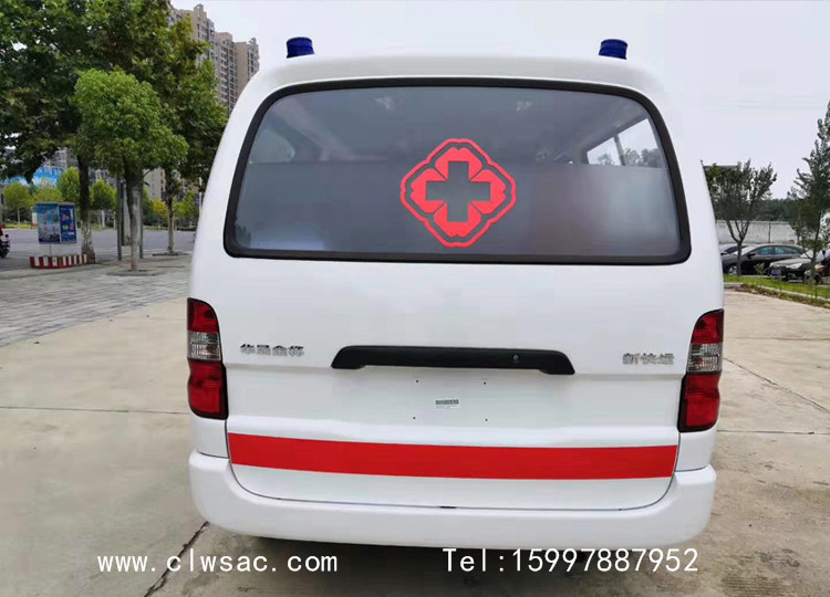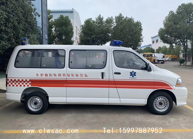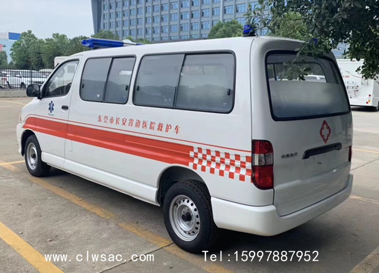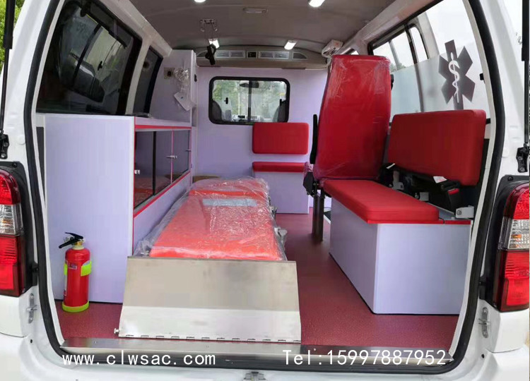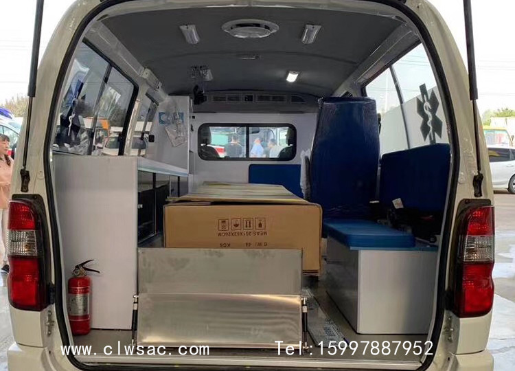 1、前顶装全蓝警灯警报器1套;2、自动上车担架;3、医药柜1件;4、固定安装氧气瓶1只;5、输液吊钩2只;6、消毒灯1只;7、污物桶1只;8、单人座椅2只;9、长条座椅2人位软座垫、软靠背和安全带1套;10、中隔断带滑窗1套;11、12V照明灯2只;12、500W逆变器1只;13、220V电源插座1组;14、医用耐磨塑胶地板革;15、贴救护十字标志;16;后舱空调和暖风