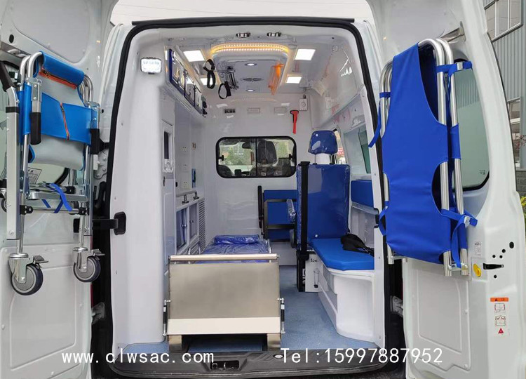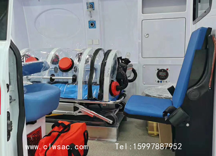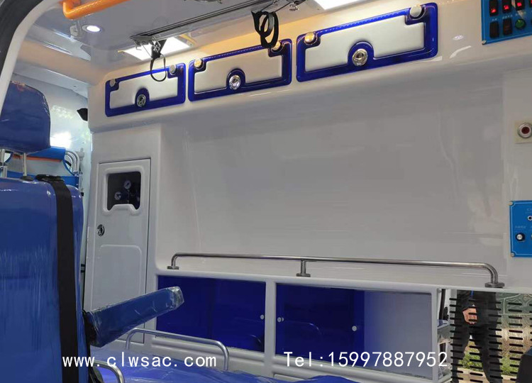 1、长排救护警灯及四周爆闪灯;2、自动上车担架;3、折叠担架;4、供氧系统:氧气瓶及氧气瓶柜、快速接口;5、左侧整体医疗柜;6、工作座椅、陪护座椅;7、消毒灯1只;8、输液吊钩2只;9、1000W逆变器1只;10、外接电源系统;11、换气扇;12、12V照明灯2只;13、220V电源插座2个;14、电源控制面板1套;15、中隔板(带观察窗);16、可冲洗医用耐磨地板;17、污物桶;18、车身广告及救护标识;19、后舱空调和暖风