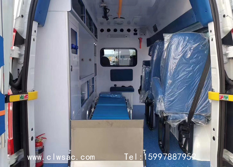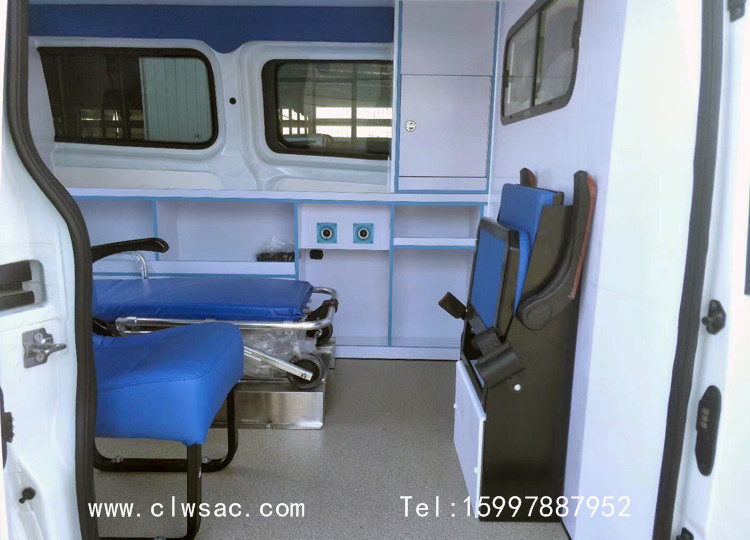 1、前顶装全蓝警灯警报器1套;2、自动上车担架;3、医药柜1件;4、固定安装氧气瓶1只;5、输液吊钩2只;6、消毒灯1只;7、污物桶1只;8、单人座椅2只;9、长条座椅2人位软座垫、软靠背和安全带1套;10、中隔断带滑窗1套;11、12V照明灯2只;12、500W逆变器1只;13、220V电源插座1组;14、医用耐磨塑胶地板革;15、贴救护十字标志;16;后舱空调和暖风