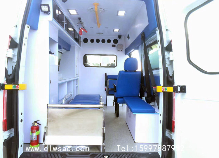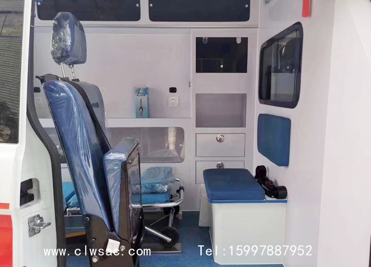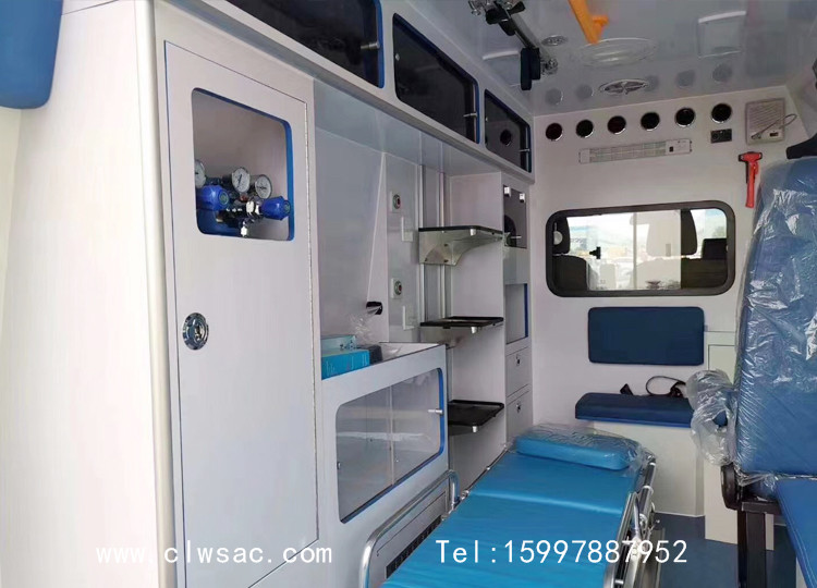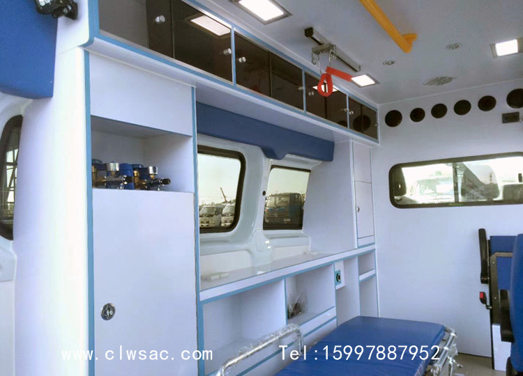 1、长排救护警灯及四周爆闪灯;2、自动上车担架;3、折叠担架;4、供氧系统:氧气瓶及氧气瓶柜、快速接口;5、左侧整体医疗柜;6、工作座椅、陪护座椅;7、消毒灯1只;8、输液吊钩2只;9、1000W逆变器1只;10、外接电源系统;11、换气扇;12、12V照明灯2只;13、220V电源插座2个;14、电源控制面板1套;15、中隔板(带观察窗);16、可冲洗医用耐磨地板;17、污物桶;18、车身广告及救护标识;19、后舱空调和暖风
