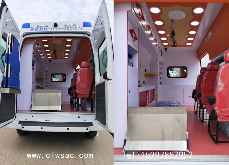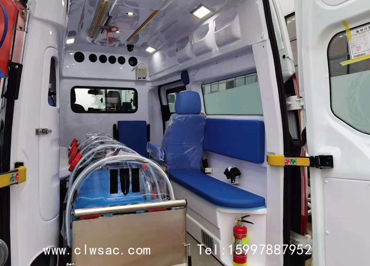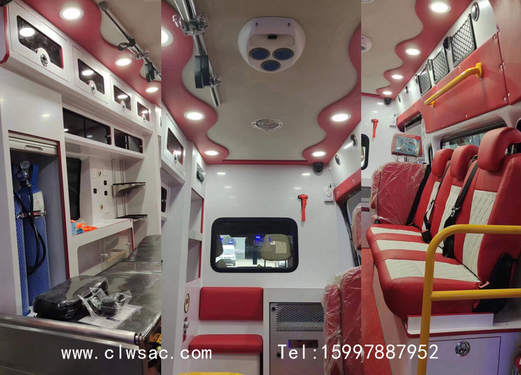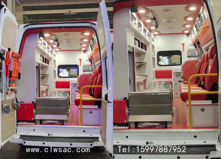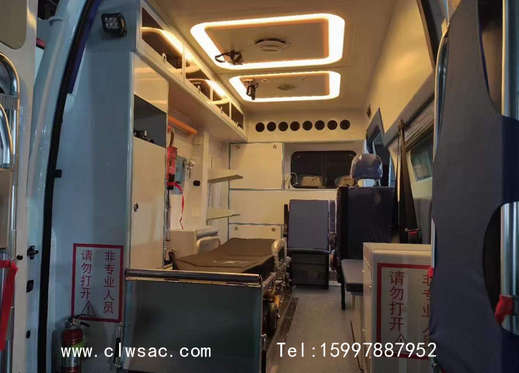 1、长排救护警灯及四周爆闪灯;2、自动上车担架;3、折叠担架;4、供氧系统:氧气瓶及氧气瓶柜、快速接口;5、左侧整体医疗柜;6、工作座椅、陪护座椅;7、消毒灯1只;8、输液吊钩2只;9、1000W逆变器1只;10、外接电源系统;11、换气扇;12、12V照明灯2只;13、220V电源插座2个;14、电源控制面板1套;15、中隔板(带观察窗);16、可冲洗医用耐磨地板;17、污物桶;18、车身广告及救护标识;19、后舱空调和暖风