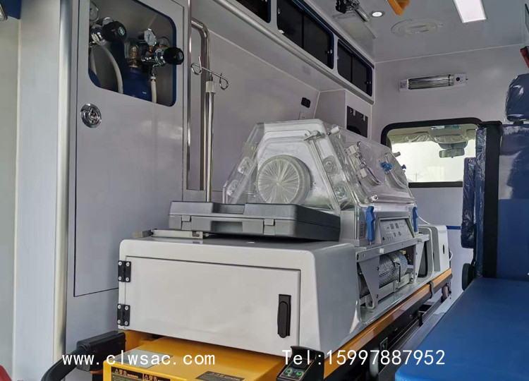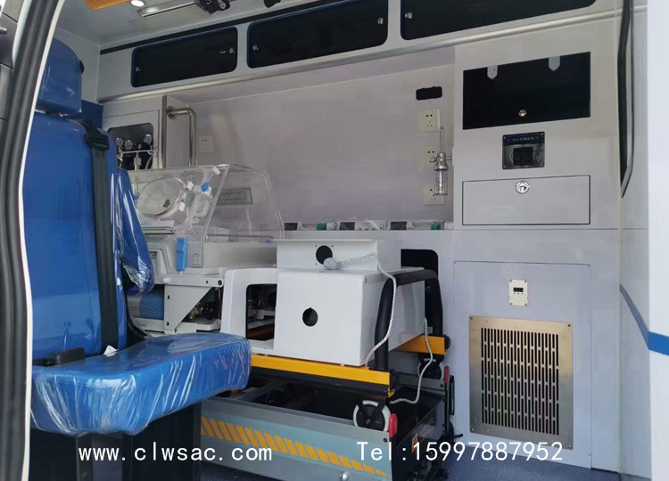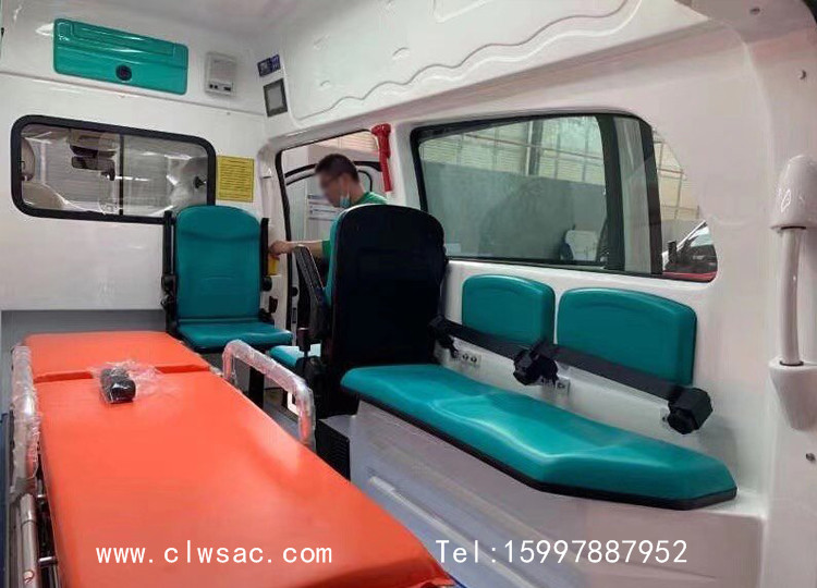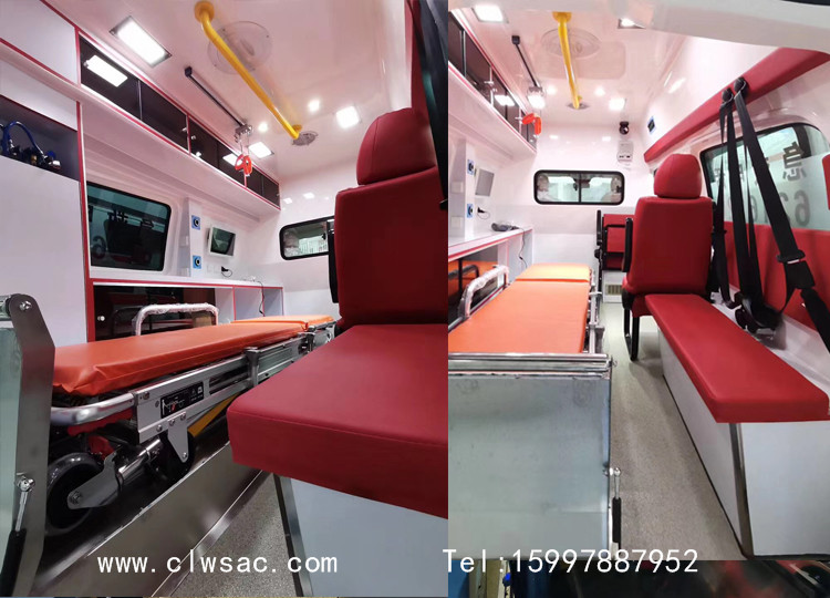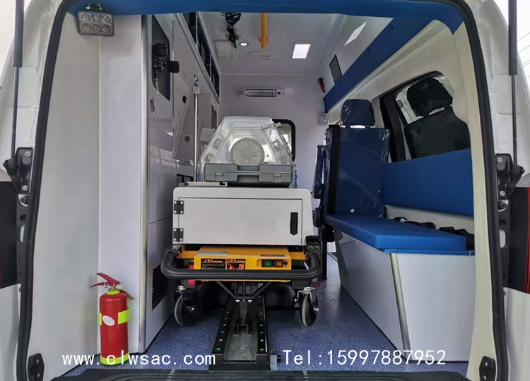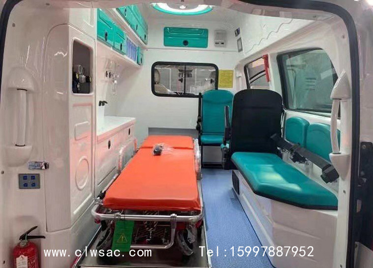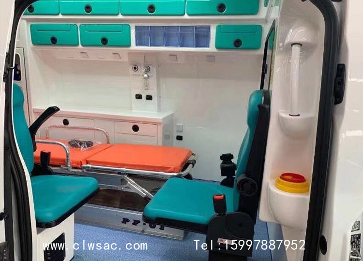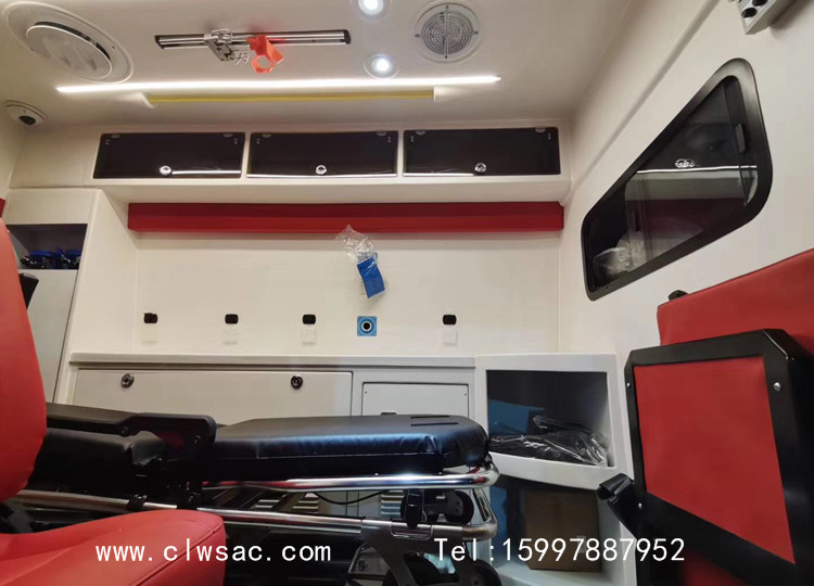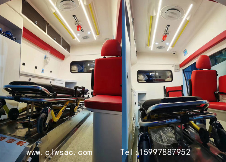 1、长排救护警灯及四周爆闪灯;2、自动上车担架;3、折叠担架;4、供氧系统:氧气瓶及氧气瓶柜、快速接口;5、左侧整体医疗柜;6、工作座椅、陪护座椅;7、消毒灯1只;8、输液吊钩2只;9、1000W逆变器1只;10、外接电源系统;11、换气扇;12、12V照明灯2只;13、220V电源插座2个;14、电源控制面板1套;15、中隔板(带观察窗);16、可冲洗医用耐磨地板;17、污物桶;18、车身广告及救护标识;19、后舱空调和暖风