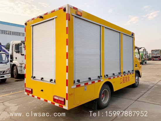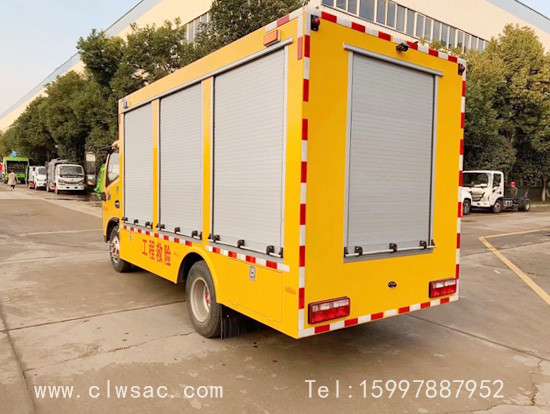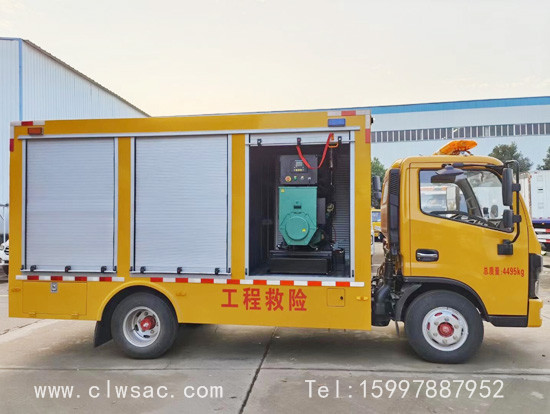 选装行李架、爬梯、车顶工作台;选装不同形状、结构的警示灯;选装中隔断(可选择开门)、车身两侧可选开上掀门、盲窗、侧开门;花纹铝板;加装设备工具柜、配电箱、发电机组、水泵、电焊机、空压机等线路安装外接电源系统、(室内灯光照明、探照灯、高杆照明灯等);绕线盘,还可根据用户不同需求加装不同的维修抢险设备、车身制作专用图案或标识。