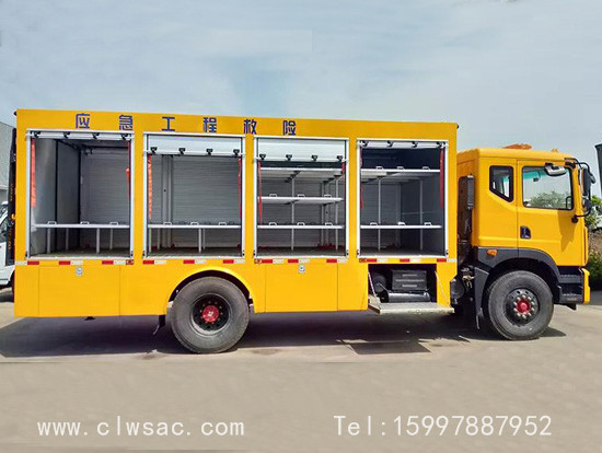 程力工程救险车选装配置:选装行李架、爬梯、车顶工作台;选装不同形状、结构的警示灯;选装中隔断(可选择开门)、车身两侧可选开上掀门、盲窗、侧开门;花纹铝板;加装设备工具柜、配电箱、发电机组、水泵、电焊机、空压机等线路安装外接电源系统、(室内灯光照明、探照灯、高杆照明灯等);绕线盘,还可根据用户不同需求加装不同的维修抢险设备、车身制作专用图案或标识。