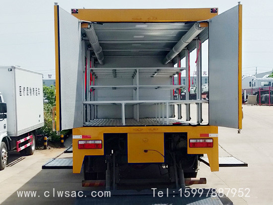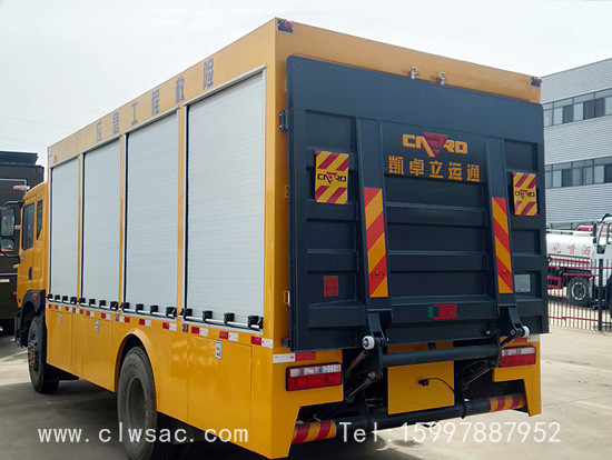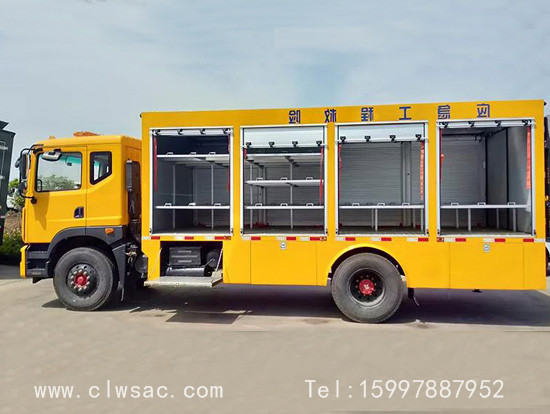 选装行李架、爬梯、车顶工作台;选装不同形状、结构的警示灯;选装中隔断(可选择开门)、车身两侧可选开上掀门、盲窗、侧开门;花纹铝板;加装设备工具柜、配电箱、发电机组、水泵、电焊机、空压机等线路安装外接电源系统、(室内灯光照明、探照灯、高杆照明灯等);绕线盘,还可根据用户不同需求加装不同的维修抢险设备、车身制作专用图案或标识。