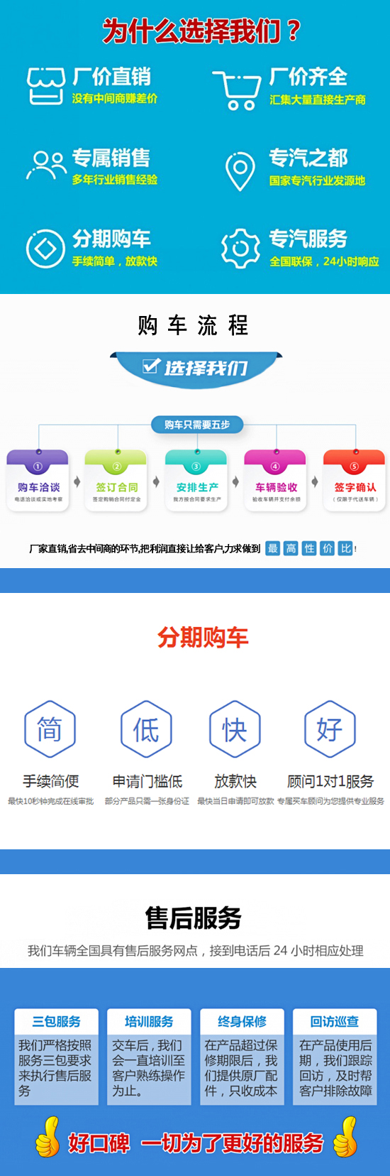 (7)我们这里有没有程力公司销售点?想看程力车怎么办?程力专用车不同于小轿车之类的在全国各地设立销售公司4S店,这是由程力专用车的特殊性决定的。利用现在发达的商务网络,客户只要来电来函下订单,按照购车流程进行购车,会在合同规定的时间范围内将车辆及车辆完整手续交到客户手上。我们将根据用户的实际需求,为每位用户打造高品质、个性化的程力专用车,欢迎您来程力专用汽车股份有限公司实地考察生产实力及产品工艺,我们会为您提供最好的服务!