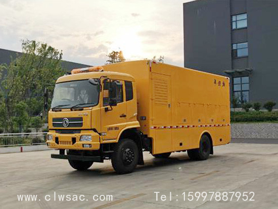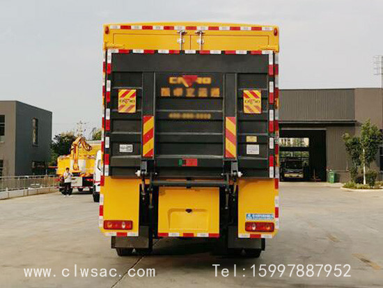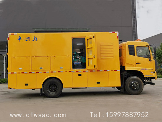 选装行李架、爬梯、车顶工作台;选装不同形状、结构的警示灯;选装中隔断(可选择开门)、车身两侧可选开上掀门、盲窗、侧开门;花纹铝板;加装设备工具柜、配电箱、发电机组、水泵、电焊机、空压机等线路安装外接电源系统、(室内灯光照明、探照灯、高杆照明灯等);绕线盘,还可根据用户不同需求加装不同的维修抢险设备、车身制作专用图案或标识。