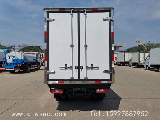 厢体:内外玻璃钢,花纹铝底板,8cm聚氨酯保温,不锈钢门锁件,配后双开门,-5度制冷机组