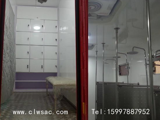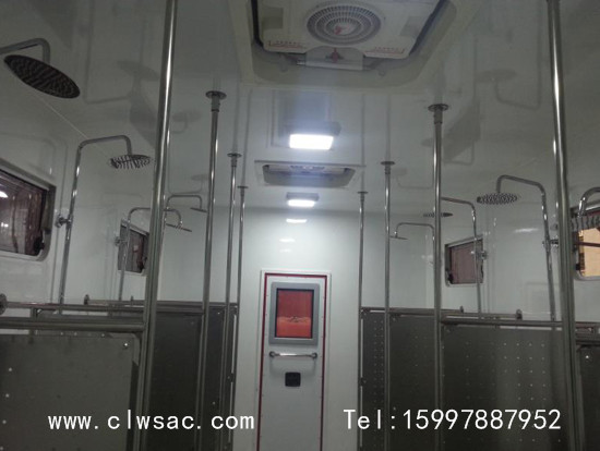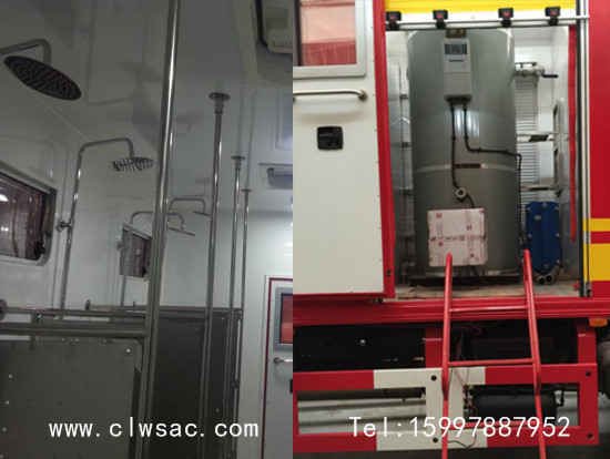 淋浴车采用汽车二类底盘,上置保温厢板,车厢内部零部件为不锈钢材质,配置水质净化装置、淋浴热水设施及更衣帐篷,具有抽水、净水、加热淋浴水、取暖、储水及更衣、洗浴等主要功能,是一种机动性强、可独立运行的洗浴装备。