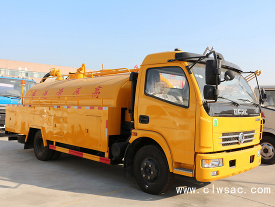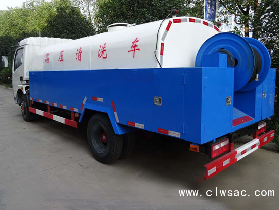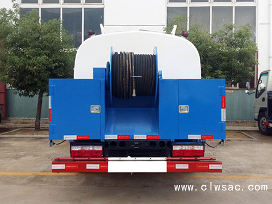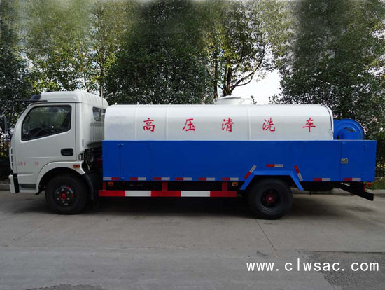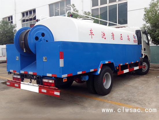 配有高压水泵的水罐车,清洗城市下水道的沉积物,疏通下水道。也可用于清洗工业排液管道、壁面等,该车可加装洒水功能兼作洒水、运水和冲洗公路用,紧急时可用于救火。