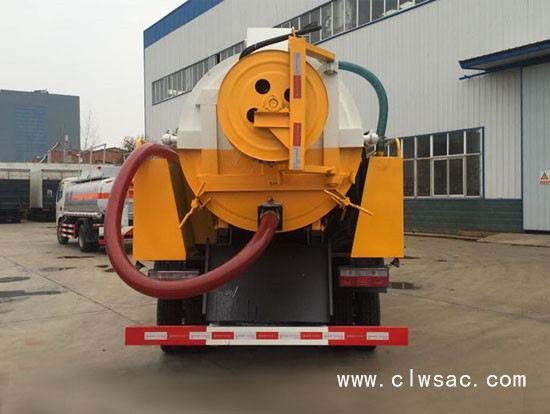 上装标配:罐体材质:Q235优质碳钢,进口高压泵,60米高压管,自动回位卷盘,10个高压冲头,带加粗污水观察管,1个自流口、洗手装置、吸污管1根、真空泵(选装水循环泵)、防溢阀,后门液压开闭,带液压自卸功能,其余按公司标配。