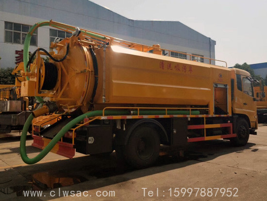上装配置:清水罐容积:4立方米,污水罐容积:9立方米,罐体材质采用Q235武钢8MM厚碳钢板,标配采用亿丰大功率10吨真空泵,油水分离器,防溢阀,视污管,配一根6米吸污管,罐体封头一次压铸成型,罐体具有举升功能,后门液压开启,配高压泵:天津通洁高压泵(意大利进口高压泵)压力:18Mpa 、流量:270L/min 、胶管长度:60m、卷管力:1800 N 、胶管内径:φ19 mm、接头型式 :1-10 、卷管速度:0-25m/min 、孔夹角度:15°,25° 推进力:≥180 N 。随车配备10个不同型号高压喷头。1-5号用于管道疏通,6-10号用于管道清洗。配有高压水泵的水罐车,清洗城市下水道的沉积物,疏通下水道。也可用于清洗工业排液管道、壁面等,该车可加装洒水功能兼作洒水、运水和冲洗公路用,紧急时可用于救火。