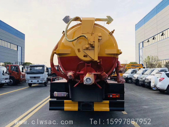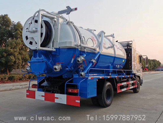 上装配置:清水罐容积:6立方米,污水罐容积:9立方米(清水罐与污水罐可自由分配),罐体材质采用Q235武钢8MM厚碳钢板,标配采用亿丰大功率10吨真空泵,油水分离器,防溢阀,视污管,配一根6米吸污管,罐体封头一次压铸成型,罐体具有举升功能,后门液压开启,配高压泵:天津通洁高压泵(选装意大利进口高压泵)压力:18Mpa 、流量:270L/min 、胶管长度:60m、卷管力:1800 N 、胶管内径:φ19 mm、接头型式 :1-10 、卷管速度:0-25m/min 、孔夹角度:15°,25° 推进力:≥180 N 。随车配备10个不同型号高压喷头。1-5号用于管道疏通,6-10号用于管道清洗。配有高压水泵的水罐车,清洗城市下水道的沉积物,疏通下水道。也可用于清洗工业排液管道、壁面等,该车可加装洒水功能兼作洒水、运水和冲洗公路用,紧急时可用于救火。