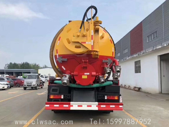 上装配置:清水罐容积:5立方米,污水罐容积:17立方米(清水罐与污水罐可自由分配),罐体材质采用Q235武钢8MM厚碳钢板,标配采用亿丰大功率双10吨真空泵(选装水循环泵),油水分离器,防溢阀,视污管,配一根6米吸污管,罐体封头一次压铸成型,罐体具有举升功能,后门液压开启,配高压泵:天津通洁高压泵(选装意大利进口高压泵)压力:15Mpa 、流量:330L/min 、胶管长度:60m、卷管力:1800 N 、胶管内径:φ19 mm、接头型式 :1-10 、卷管速度:0-25m/min 、孔夹角度:15°,25° 推进力:≥180 N 。随车配备10个不同型号高压喷头。1-5号用于管道疏通,6-10号用于管道清洗。配有高压水泵的水罐车,清洗城市下水道的沉积物,疏通下水道。也可用于清洗工业排液管道、壁面等,该车可加装洒水功能兼作洒水、运水和冲洗公路用,紧急时可用于救火。