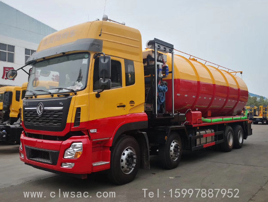 该车采用东风天龙8x4系列底盘,加装高压泵、高压管、自动回位卷盘、高压冲头、真空吸污泵、压力罐体、液压部分、管网系统、真空压力表、油水分离器、视污窗、洗手装置等改装而成,安装朝柴,玉柴,云内等发动机,排放达到国六标准。
