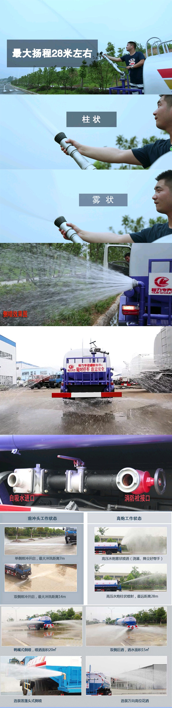 该车外形美观、驾驶舒适、操纵方便、机动灵活、可靠性高,适合于各种路面冲洗,树木、绿化带、草坪绿化,道路、厂矿企业施工建设,高空建筑冲洗。具有洒水、压尘、高/低位喷洒、农药喷洒、冬季除雪、消防、护栏冲洗等功能。