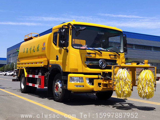 容积:14立方米,标准配置:专用洒水泵、前冲、后洒、侧喷、花洒2个、平台高炮、自流阀及消防接头各1个,水管2根。