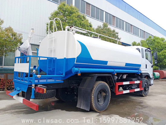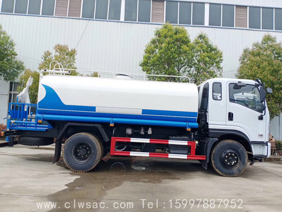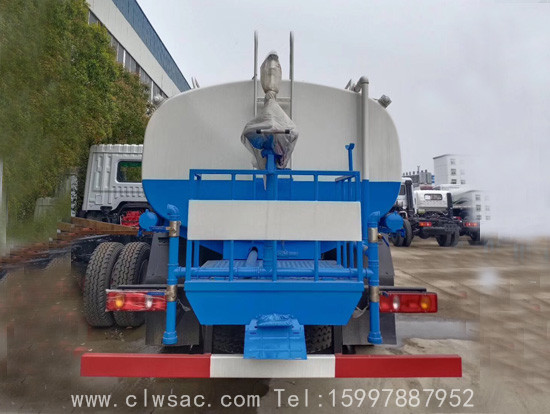 上装配置:罐体采用Q235优质碳钢板制作,容积:11立方米,标准配置:专用洒水泵、前冲、后洒、侧喷、花洒2个、平台高炮、自流阀及消防接头各1个,水管2根。