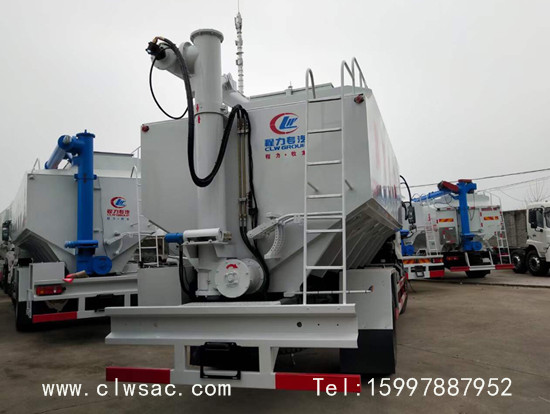 3、28方散装饲料车主要采用柳汽乘龙,玉柴200马力发动机(5100mm轴距)底盘改装而成,整车尺寸:9100×2500×3800mm,罐体尺寸:6300×2500×2580mm,罐体内分为三个仓,可独立控制各分仓卸料顺序和速度。顶部出料绞龙(长度6.86米)举升高度8.2米(60°卸料时),卸料时间550kg/min。此款车型是单桥里容积最大的一款。