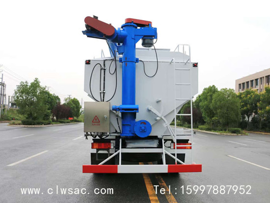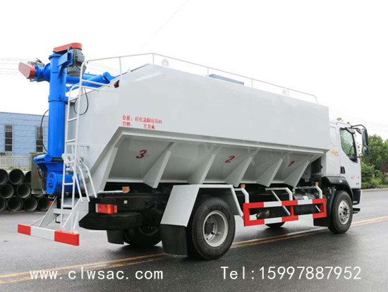 3、28方散装饲料车主要采用柳汽乘龙,玉柴200马力发动机(5100mm轴距)底盘改装而成,整车尺寸:9100×2500×3800mm,罐体尺寸:6300×2500×2580mm,罐体内分为三个仓,可独立控制各分仓卸料顺序和速度。顶部出料绞龙(长度6.86米)举升高度8.2米(60°卸料时),卸料时间550kg/min。此款车型是单桥里容积最大的一款。
