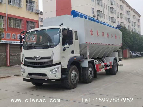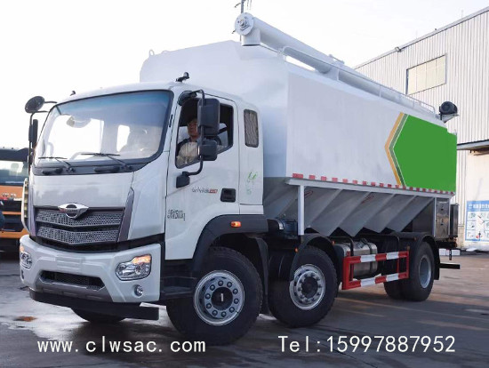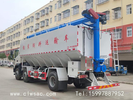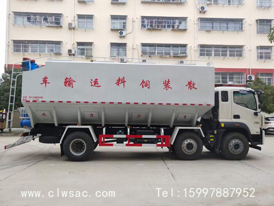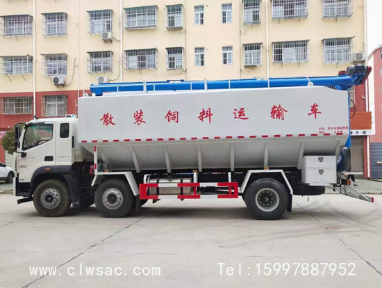 散装饲料运输车,又名散装饲料车,饲料运输车。主要用于从饲料厂向畜牧场、养禽场及饲料加工用户运输散装饲料成品或饲料生产原粮,同时它也可用来运输某些无腐蚀性粉粒状原料,如制药厂粉料和粮库周转。