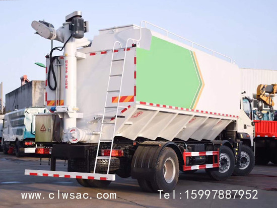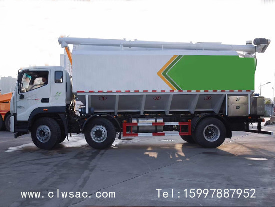 3、28方散装饲料车主要采用柳汽乘龙,玉柴200马力发动机(5100mm轴距)底盘改装而成,整车尺寸:9100×2500×3800mm,罐体尺寸:6300×2500×2580mm,罐体内分为三个仓,可独立控制各分仓卸料顺序和速度。顶部出料绞龙(长度6.86米)举升高度8.2米(60°卸料时),卸料时间550kg/min。此款车型是单桥里容积最大的一款。