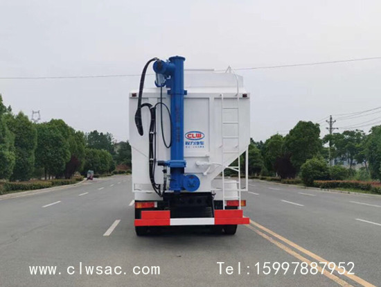 2、22-26方散装饲料车主要采用东风天锦,康明斯180马力发动机(5000mm轴距)底盘改装而成,整车尺寸:9000×2460×3800mm,罐体尺寸:6100×2450×2190mm,罐体内分为三个仓,可独立控制各分仓卸料顺序和速度。顶部出料绞龙(长度6.86米)举升高度8米(60°卸料时),卸料时间550kg/min。