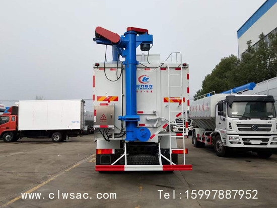 3、28方散装饲料车主要采用柳汽乘龙,玉柴200马力发动机(5100mm轴距)底盘改装而成,整车尺寸:9100×2500×3800mm,罐体尺寸:6300×2500×2580mm,罐体内分为三个仓,可独立控制各分仓卸料顺序和速度。顶部出料绞龙(长度6.86米)举升高度8.2米(60°卸料时),卸料时间550kg/min。此款车型是单桥里容积最大的一款。