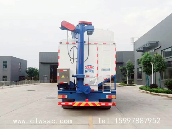 2、22-26方散装饲料车主要采用东风天锦,康明斯180马力发动机(5000mm轴距)底盘改装而成,整车尺寸:9000×2460×3800mm,罐体尺寸:6100×2450×2190mm,罐体内分为三个仓,可独立控制各分仓卸料顺序和速度。顶部出料绞龙(长度6.86米)举升高度8米(60°卸料时),卸料时间550kg/min。